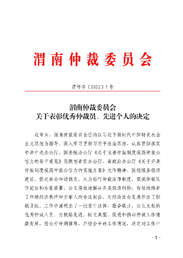渭南仲裁委員會 關于表彰優(yōu)秀仲裁員、先進個人的決定